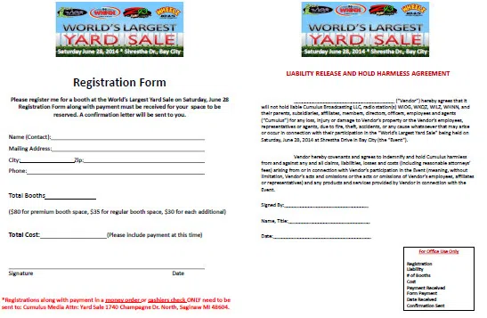 Vendors — Please fill out this form and send it to Cumulus Media (Attn: Yard Sale) at 1740 Champagne Dr. North, Saginaw MI 48604.