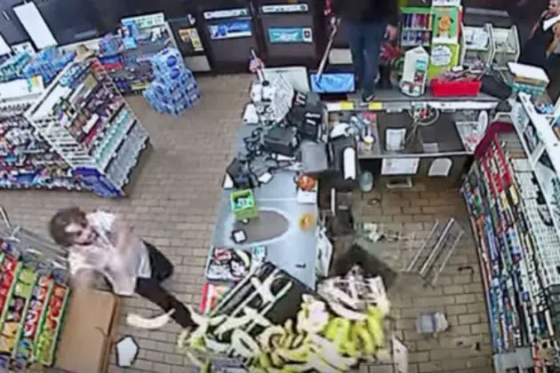 In the video above, you see the employee escort the man out of the store, only for him to return to push over a few different things, including a banana display.