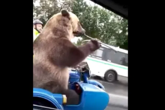 The video was apparently filmed in Russia and features a bear, rolling in a sidecar, tooting away on his horn.