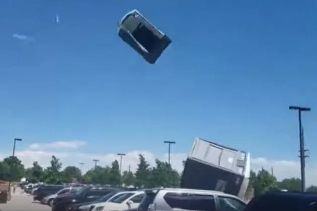 The winds were blowing furiously in Colorado recently and that led to a couple of porta-potties flying across a parking lot, as you can see in the video above.