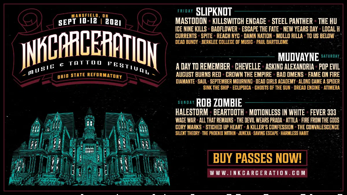 Graphic Credit: Danny Wimmer PresentsThe 2021 edition of the Inkcarceration Music and Tattoo Festival at the Ohio State Reformatory will feature performances by Slipknot, Mudvayne, and Rob Zombie, amo...
